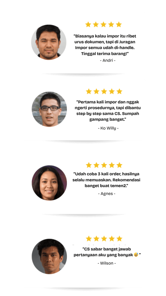 Ratusan klien dari berbagai bidang usaha sudah mempercayakan proses impornya kepada kami. Testimoni positif dan repeat order jadi bukti nyata pelayanan kami.